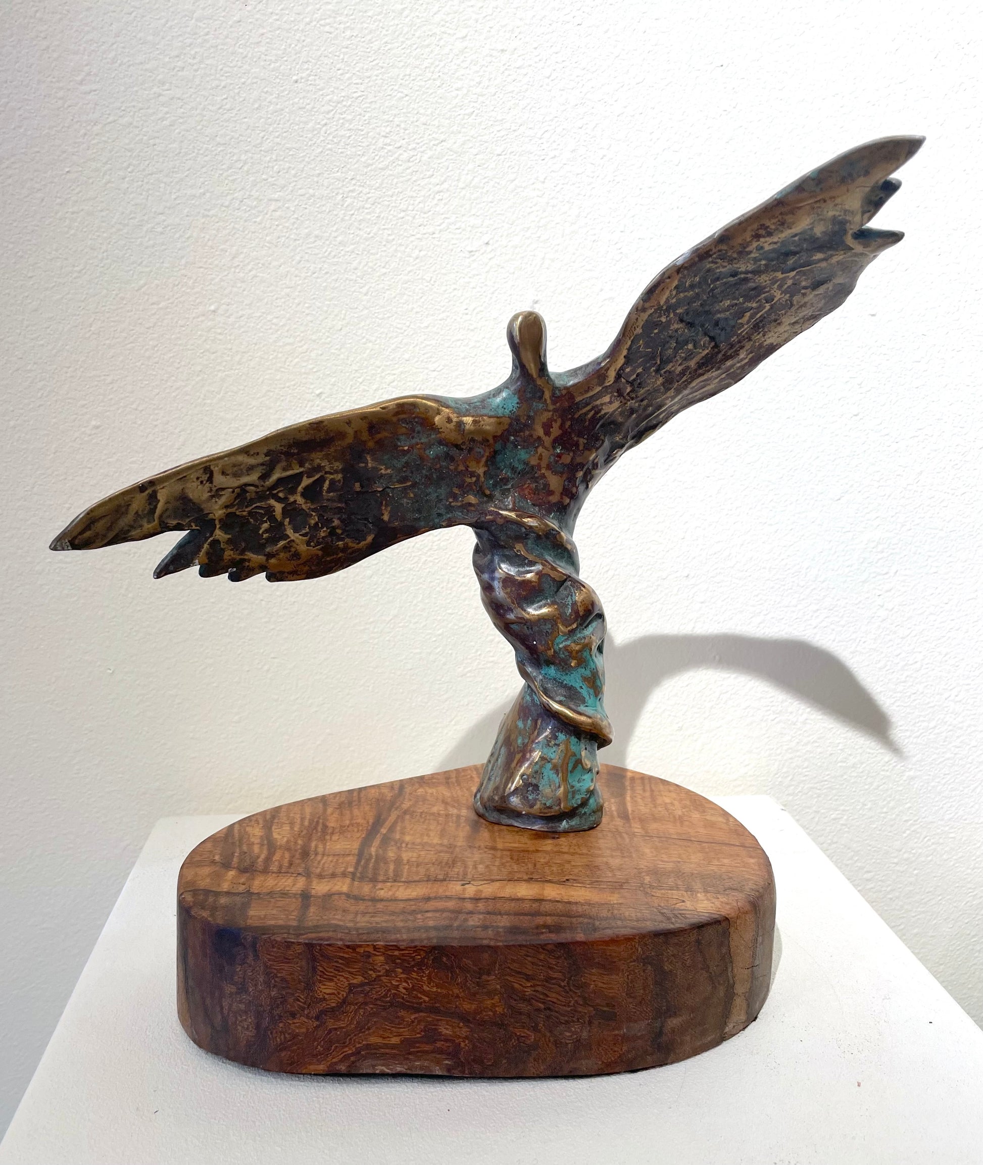 Ginny Walden, "Guardian of the Way" Bronze Edition, cupric patina, 11/12, base of Hawaiian Ribbon Koa, 9”Hx12”Wx2.5”D