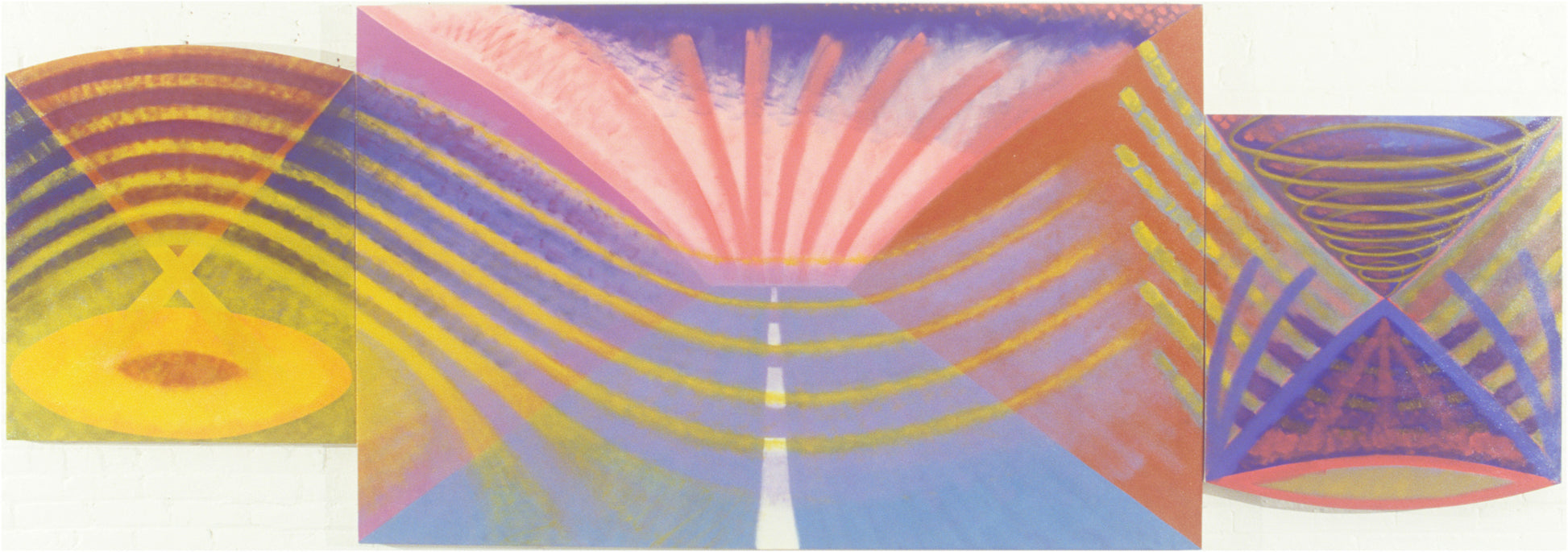 A luminous painting layered with striking color. Swooping lines and geometric shapes evoke the graphic sensibility of minimalist abstraction. One enjoys the play of color and form for its own sake and is then invited into a deeper experience when one learns that the painting is inspired by the artist's personal UFO encounter in the early 1970's.