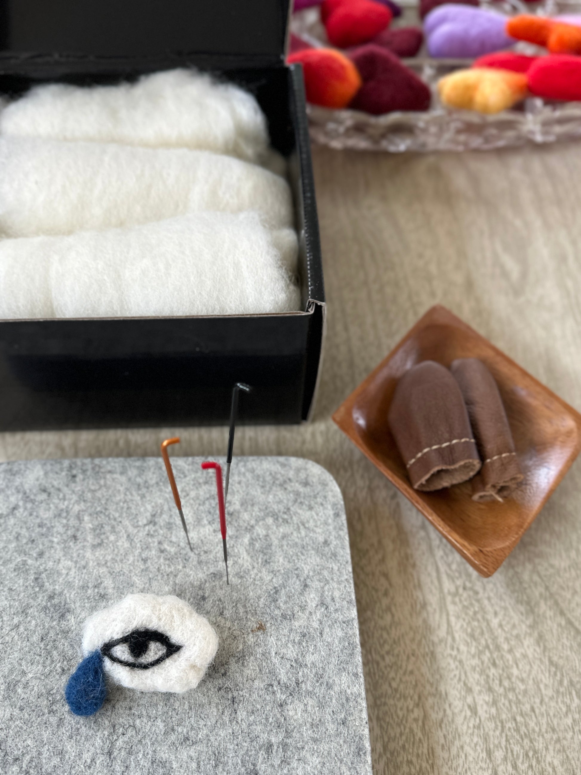Felting needles, leather finger guards, wool felting pad, wool assortment, embellishments (beads, charms, threads)
